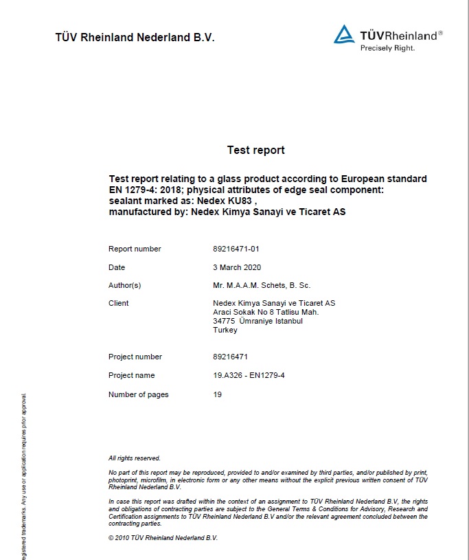 NEDEX polisülfit esaslı ikincil cam macunları 'KU-83' ve 'PS-018', yeni EN normlarını ifade eden EN 1279:2018 spesifikasyonlarına uygun şekilde yapılan testleri başarıyla geçti.